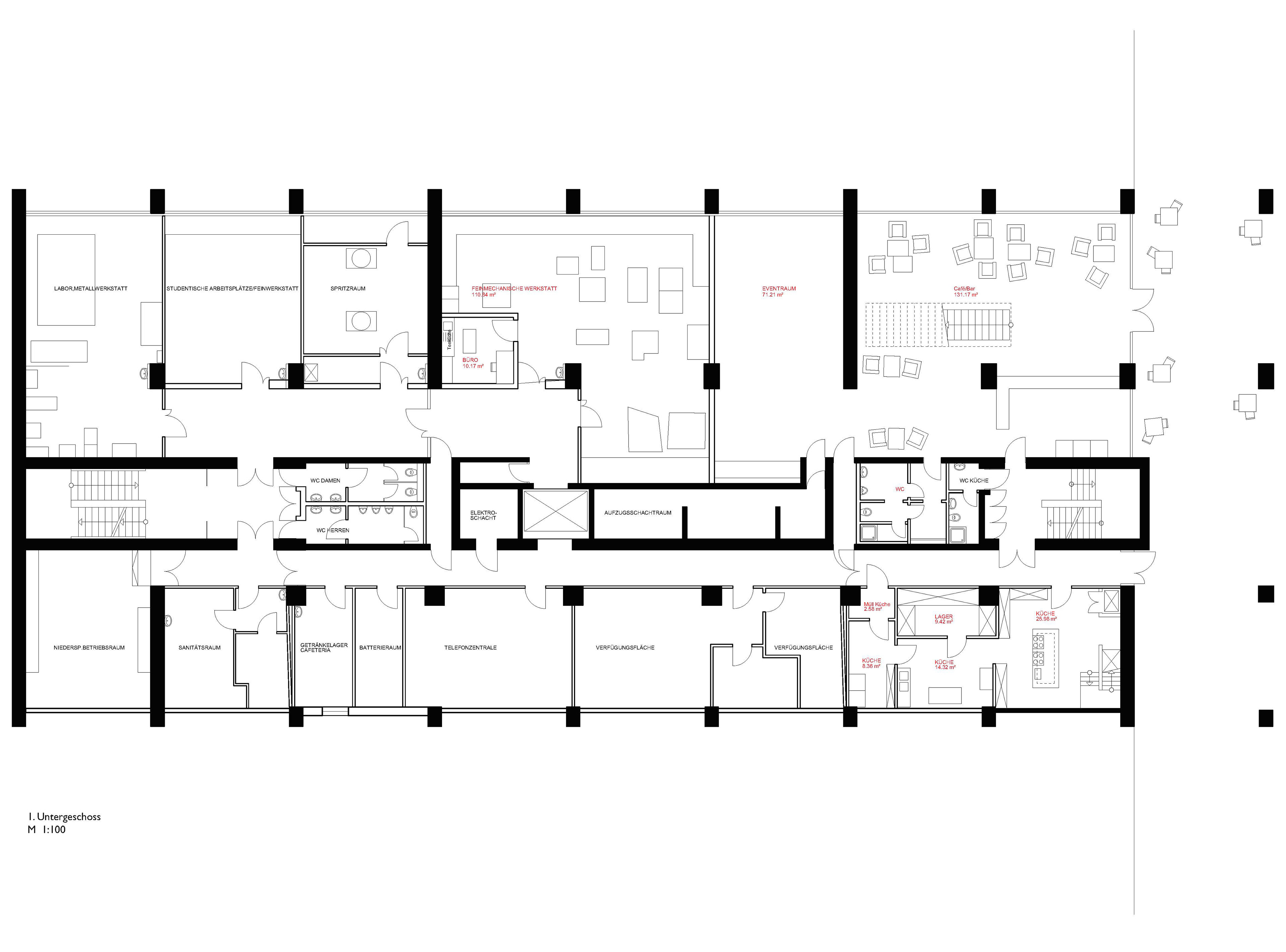 The cafeteria at the Architecture Faculty of the University of Stuttgart does not live up to the beauty of the building in which it is located. The view of the beautifully crafted concrete wall, which at the right time reflects a rhythmic play of light and shadow, is hindered by randomly placed tables and loud vending machines. The space between the wall and the concrete pillars needs to be liberated. The wall and the axis along it frame an unobstructed view through the tower, a theme present on all the other floors. The strong grid structuring the floor plans is evident through the large concrete pillars and the stoic rhythm of the curtain-wall facade.