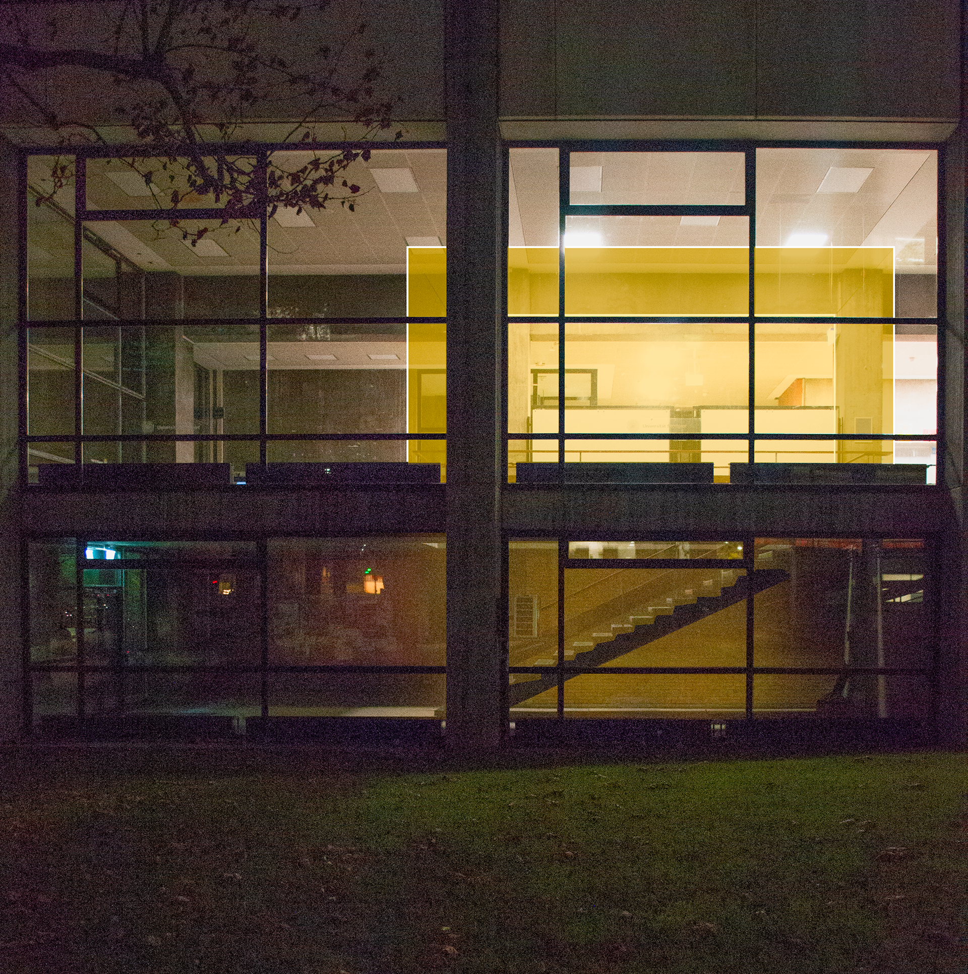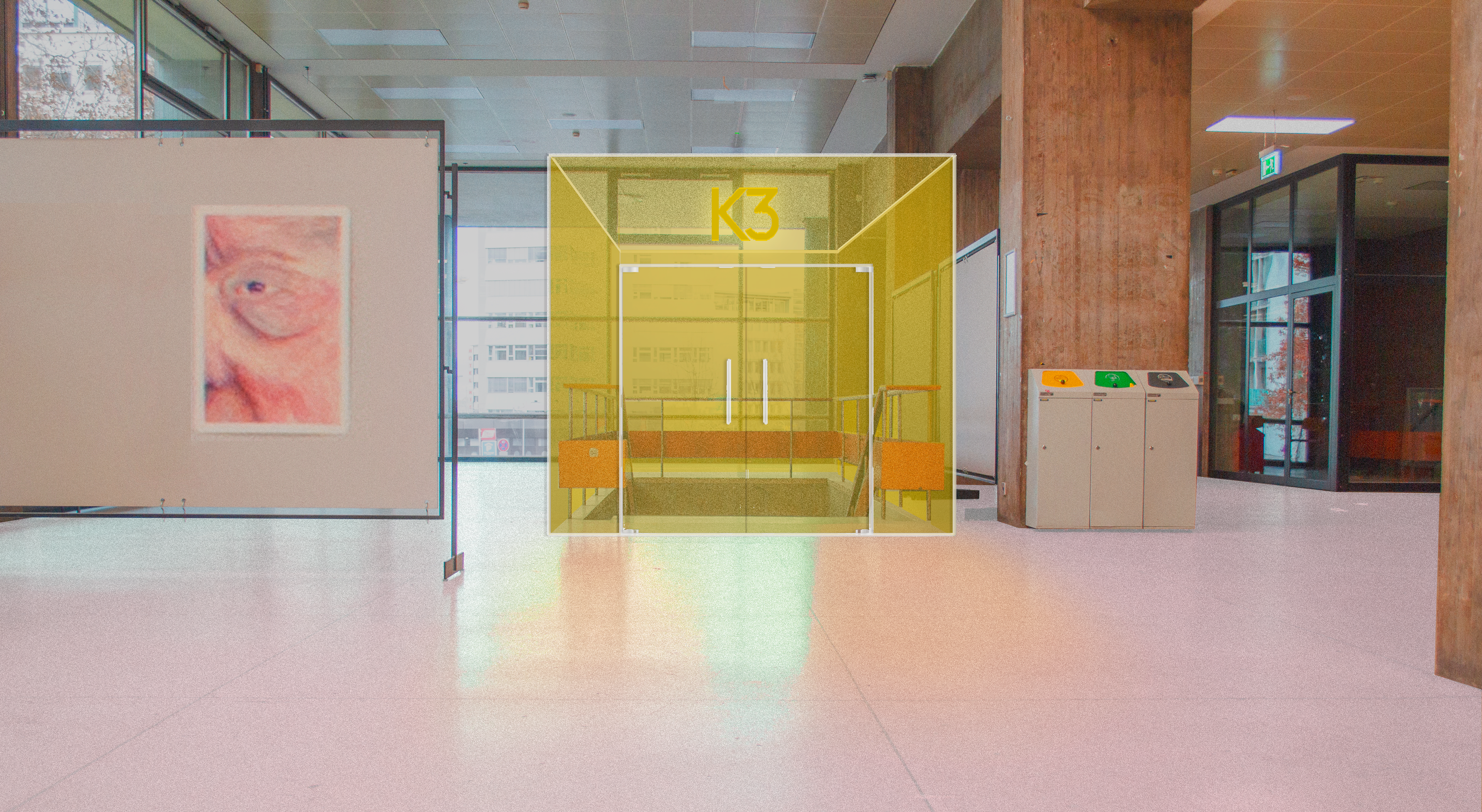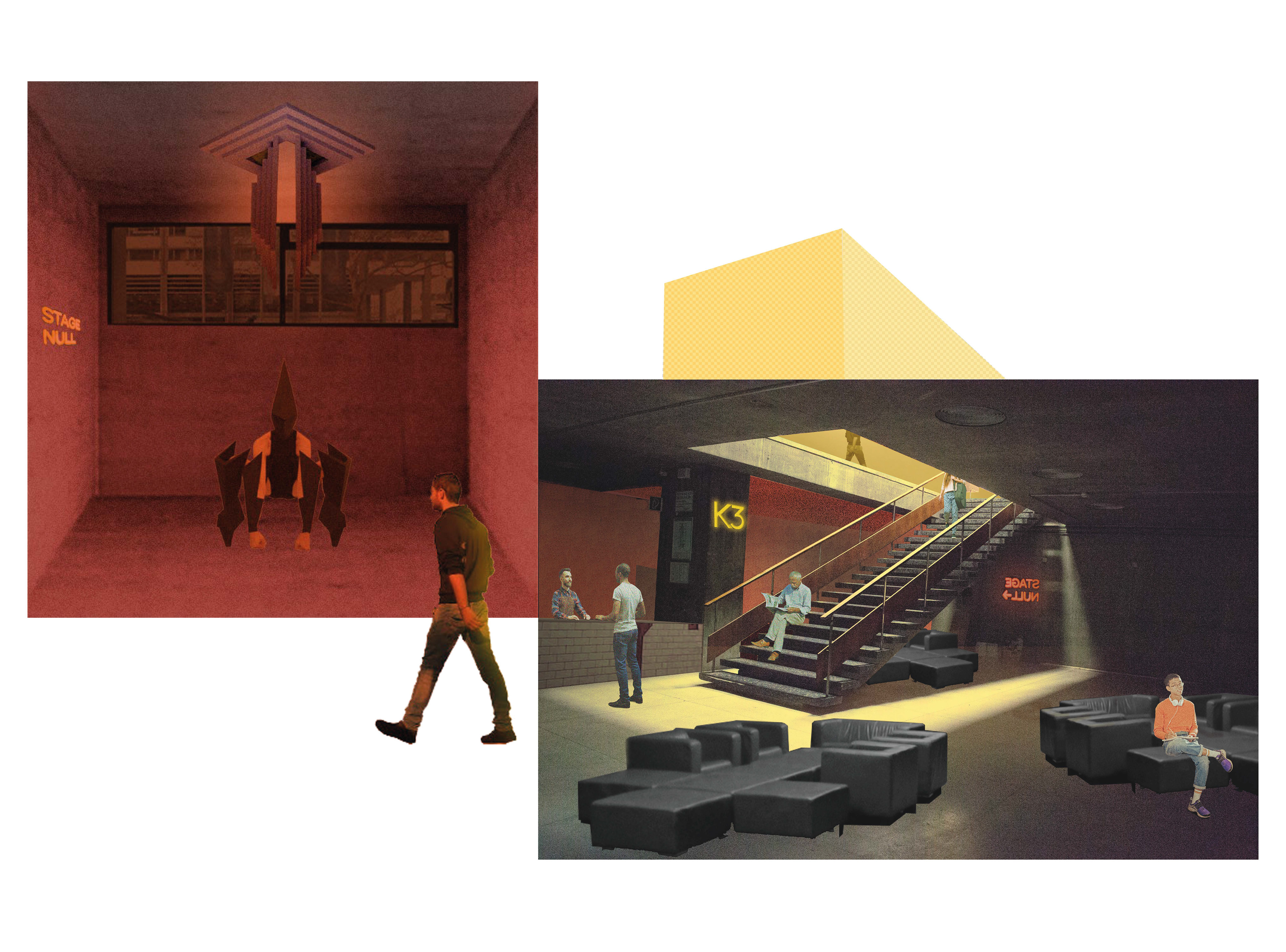 K3 comes to life as a café-bar removed from study-related activities, featuring a yellow glass box that breaks through the ground floor, enclosing the bar when needed and providing an entrance at the upper level. During summer, small tables can be placed in front of the café under the cantilever, activating the street level and inviting the community to participate in the faculty’s activities. At night, the yellow glass box works as a giant light bulb, filtering the white light on the ground floor and creating a vibrant bar atmosphere. In the back room, the bar Stage Null becomes an open room for events, small exhibitions, and installations, managed by the students in cooperation with the Studierendenwerk.