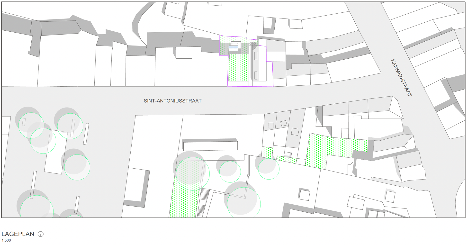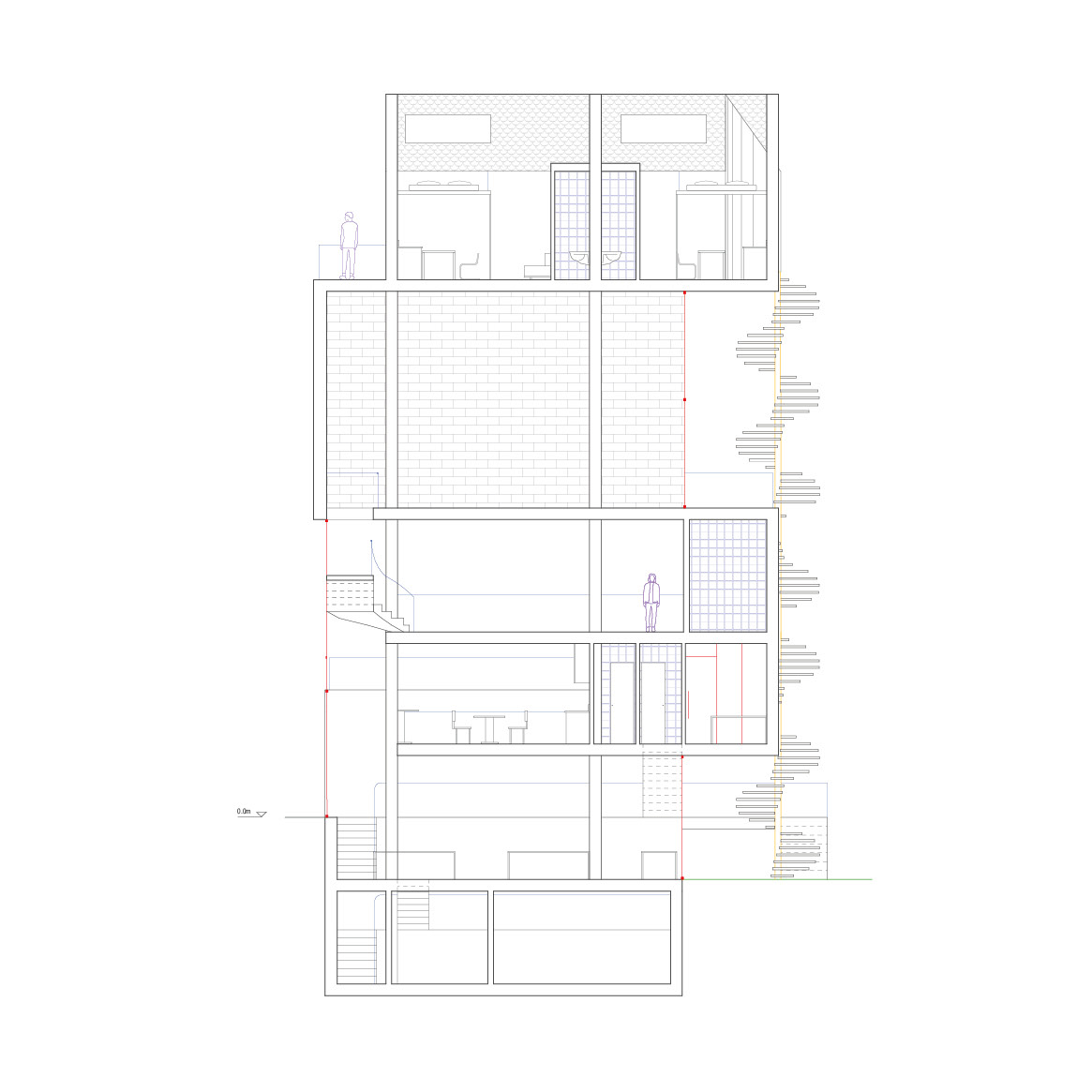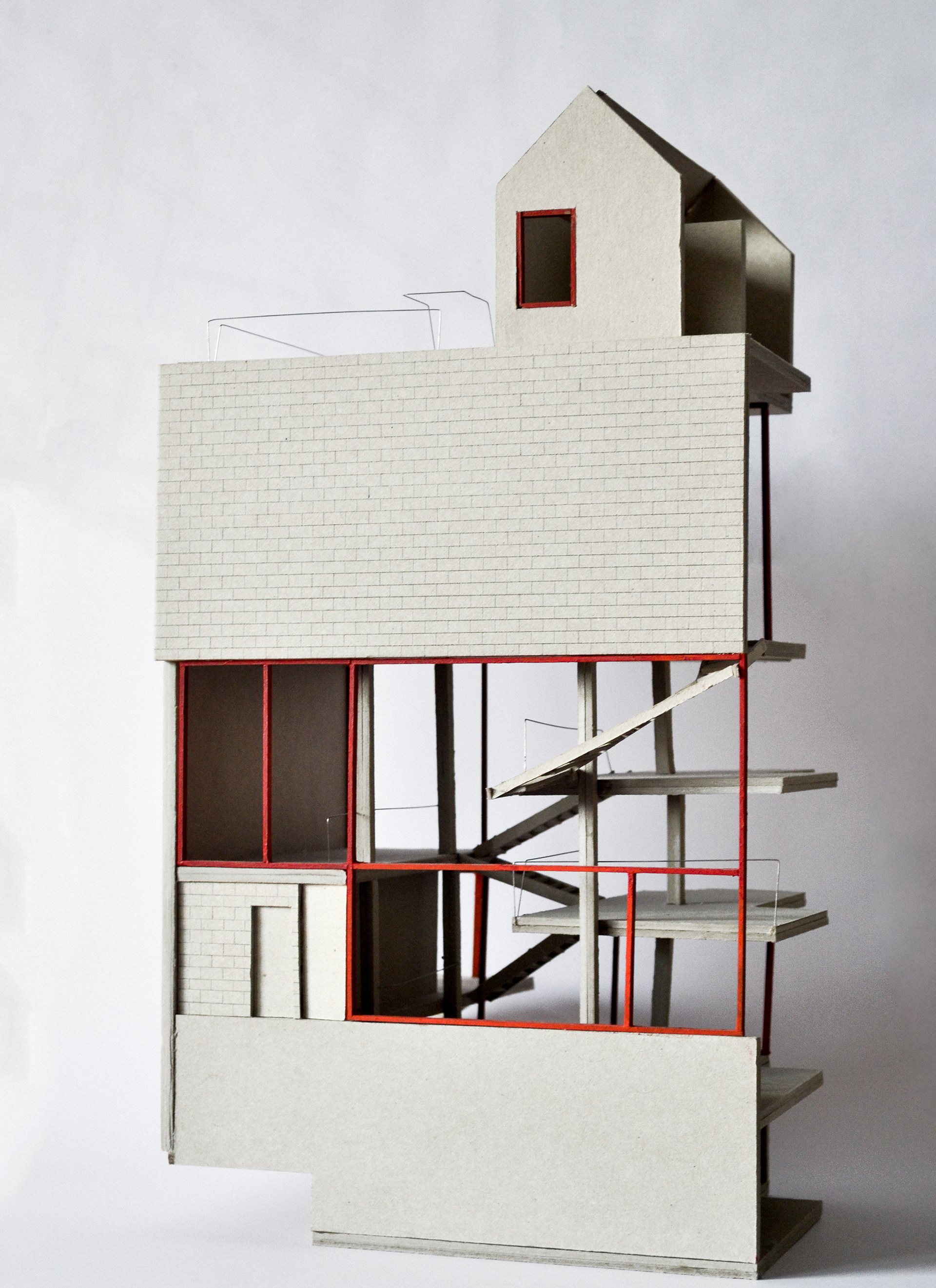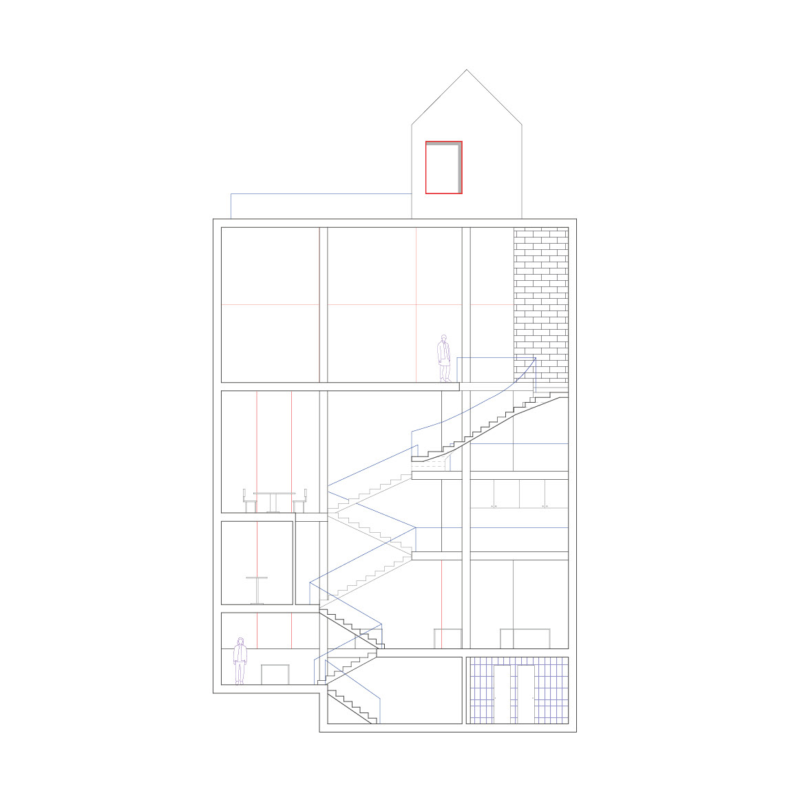 The ateliers are located 1.5 meters below street level. The communal kitchen, workshops, and lounge area are divided into three open levels. The ateliers on the bottom form the foundation for all the other functions, opening outward so passers-by can observe not only the production process but also its progression upwards to the showroom, which is completely closed off from the street. At the very top of the building, in the tiny-house attachment, are two studio apartments and a common rooftop garden.